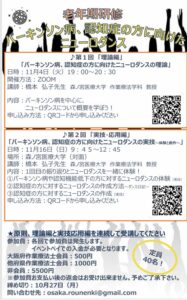 Newsお知らせ 2025.09.22 老年期領域チーム 【2025年11月4日(火)・11月16日(日)】老年期研修 パーキンソン病、認知症の方に向けたニューロダンス PDF ★原則、理論編と実技応⽤編を連続して受講してください 11月4日(火)第1回「理論編」のお申込みページはこちら 11月16日(日)第2回「実技・応用編」のお申込みページはこちら 一覧に戻る
