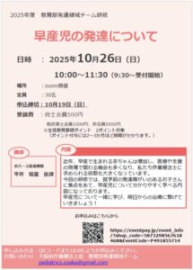Newsお知らせ 2025.09.26 発達期領域チーム 【2025年10月26日(日)】早産時の発達について PDF 参加費:大阪府士会員500円 他県士会員1000円 非会員5500円 お申込みはこちら 一覧に戻る