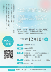 Newsお知らせ 2025.10.22 堺ブロック 【2025年12月10日(日)】公認心理士による 回復期リハビリ病棟での心理職の役割と他職種との連携 PDF 参加費:大阪府士会員500円 他県士会員1000円 非会員5500円 お申込みはこちら 一覧に戻る