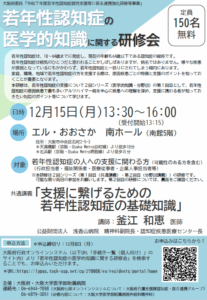 Newsお知らせ 2025.11.25 関係団体主催の研修会 【2025年12月15日(月)】大阪府委託 令和7年度若年性認知症就労支援等に係る連携強化研修等事業「若年性認知症の医学的知識に関する研修会」 PDF 一覧に戻る