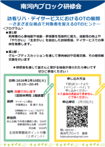 テーマ:訪看リハ・デイサービスにおけるOTの展開 ~さまざまな視点で対象者を捉えるOTのヒント~ 在宅維持期に関わるOTは心身機能や活動・参加面を包括的に捉え、 利用者への主体的な活動の提案を通じて活動性の向上や 「やりがい」・「生きがい」の創出を図ることが求められます。 訪問看護、デイサービスでの事例を通じて、 明日へのヒントを掴んでいただければ幸いです。 〇日時:2026年2月10日(火)19:15~20:45 〇研修形式:対面で行います 〇場所:富田林病院 講堂2階 〇参加費: 大阪府士会員 500円(今年度府士会費納入者) 他府県士会員 1000円 非会員 5000円