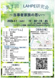 Newsお知らせ 2025.12.22 関係団体主催の研修会 【2026年3月1日(日)】第7回LAHPE研究会 ~当事者家族の思い~| PDF お問合せ✉lahpe2018@gmail.com ホームページhttps://lahpe2018.mystrikingly.com/ 一覧に戻る