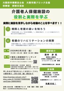 Newsお知らせ 2026.01.21 大阪市南ブロック 【2026年2月20日】大阪市南ブロック 体験型交流会介護老人保健施設の役割と実際を学ぶ PDF 参加費:府士会員500円他県士会員1000円非会員5500円 お申込みはこちら 一覧に戻る