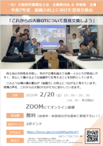 Newsお知らせ 2026.01.23 企画委員会・学術部 【2026年2月20日(金)】企画委員会・学術局主催 令和7年度 組織力向上に向けた意見交換会「これからの大阪OTについて意見交換しよう」 PDF 参加費:無料(休会中、非会員の方もぜひご参加ください) お申込みはこちら 一覧に戻る