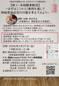 Newsお知らせ 2026.01.29 北河内ブロック 【2026年2月27日(金)】北河内ブロック\新人・未経験者歓迎/~まずはここから!事例を通して神経発達症児の行動を考えてみよう~ PDF 参加費:大阪府士会員500円他府県市会員1000円非会員5000円学生無料 お申込みはこちら 一覧に戻る