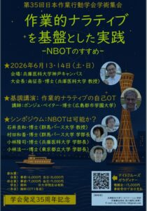Newsお知らせ 2026.03.02 関係団体主催の研修会 【2026年6月13日(土)・14日(日)】第35回日本作業行動学会 学術集会「作業的ナラティブを基盤とした実践~NBOTのすすめ~」 PDF 一覧に戻る